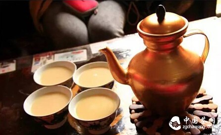 將青磚茶敲碎,取50克左右的茶葉放到能裝四、五斤水的銅壺或鐵禍內,用沸水沖沏后再在微火上煮沸幾分鐘或直接用冷水煮開,等湯色濃后摻入一、二勺奶和一些鹽即成盛奶茶。蒙古族和藏族牧民愛喝鹽奶茶。他們每天旱晨煮一大壺置于微火上,趁熱邊喝鹽奶茶邊吃炒米和酪蛋子,一直到吃飽為止。