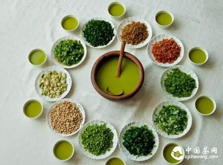貴州的布依族,廣西的侗族、苗族同胞都愛喝打油茶。不過,們們的做法略有不同。步依族的打油茶做法是,先把黃豆、玉米、糯米等用油炒熟混合放在茶碗里,然后用油把茶葉炒香后放入少量的姜、蔥、鹽和水煮,直到沸騰為止,去渣后倒入茶碗里拌勻即成打油茶。布依族同胞有“早茶一盅,一天威風;午茶一盅,勞動輕松;晚茶一盅,全身疏通;一天三翌,雷打不動”之說。